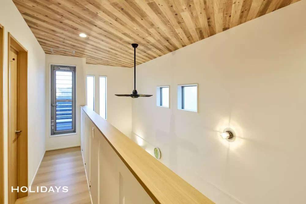 2階の廊下も大きな吹抜けを設置することで、廊下すべてからリビングを見渡せ、
