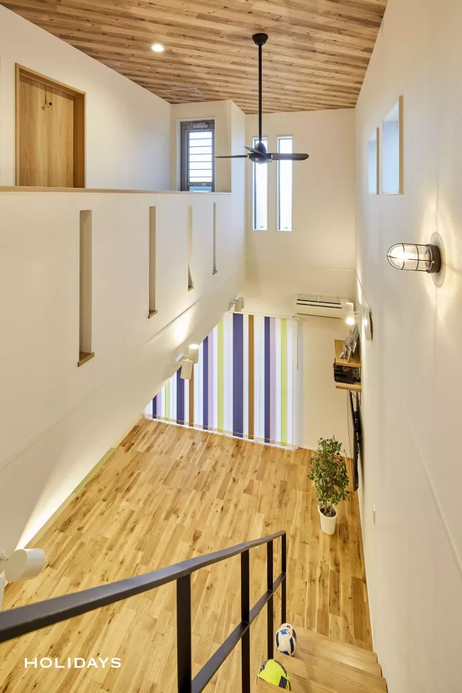 吹抜けの天井には木目調のアクセントクロスと ブラックのシーリングファンでアクセントを