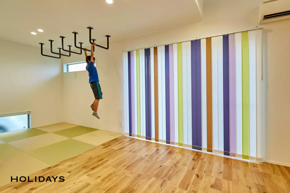 リビングからつながる和室に雲梯(うんてい)を設置。 遊び心も忘れずに