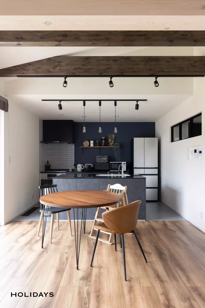 勾配天井と化粧梁が見どころのダイニング空間。梁下のダクトレールとスポットライトは空間演出に。またウッドブラインドや家具の色味を揃えることで、ノイズレスな空間に仕上がった。