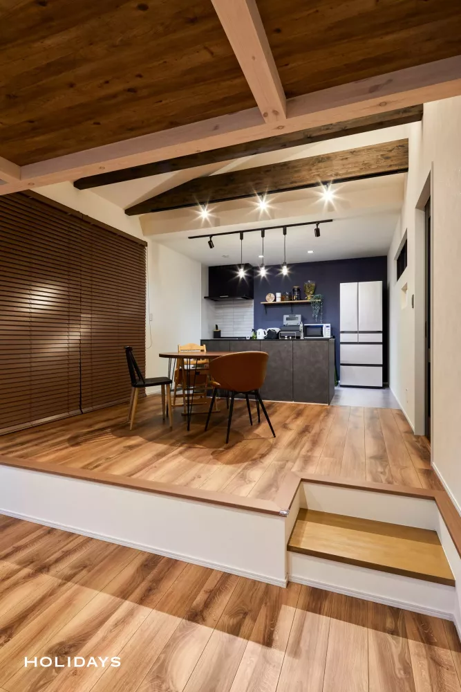 天井高はそのままにダウンリビングとすることで、少し洞窟感の出る空間に。天井の木目のアクセントクロスと化粧梁の組み合わせは統一感があり相性抜群。