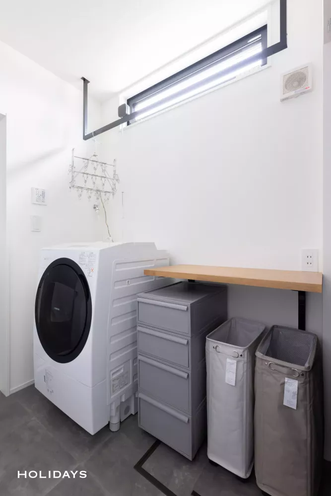 ハンガーパイプを備えた脱衣室では、洗濯→干す→収納が同じ場所で完結する設計に。家事の時間と手間を減らすことで家族団欒の時間を増やす。