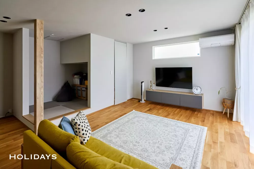 リビングともなじむようグレー系の畳を使用した2.5畳の小上がり。階段下を利用した収納スペースもあり、オープンな空間ながらちょうどいいお篭り感のある空間となった。