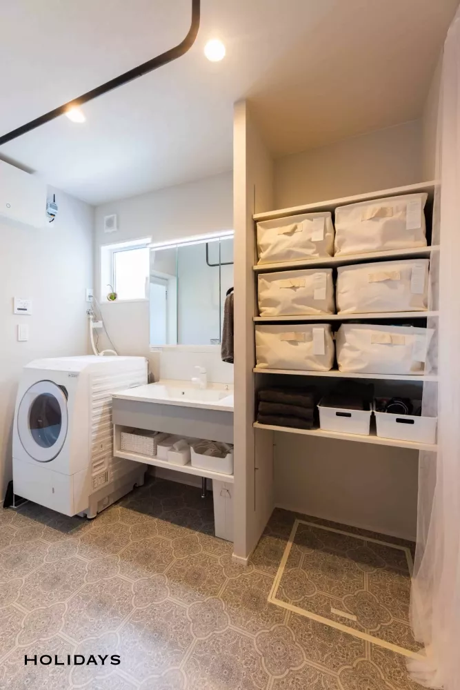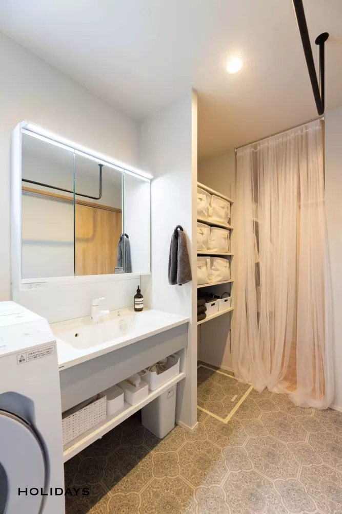 玄関から続く洗面台はパナソニック シーラインを使用して造作風に。コンパクトですっきりとした印象に仕上げた。横にはタオル類がしまえる可動棚を設置し、収納力もバッチリ。