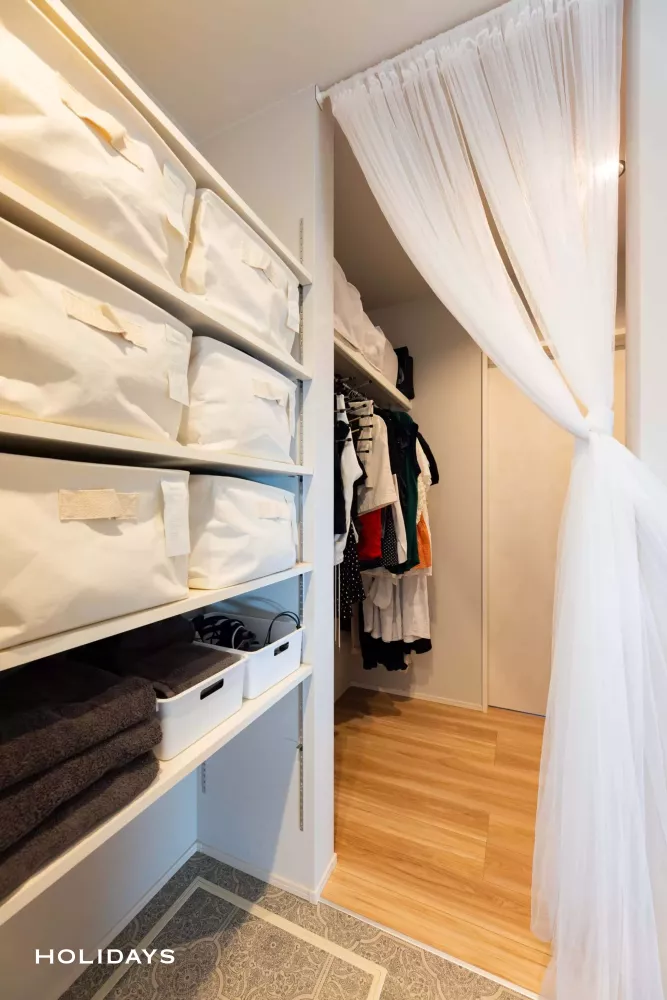 出入口にあえて扉を入れないことで使いやすさを優先。レースで間仕切りプライバシーを守れるように工夫している。
