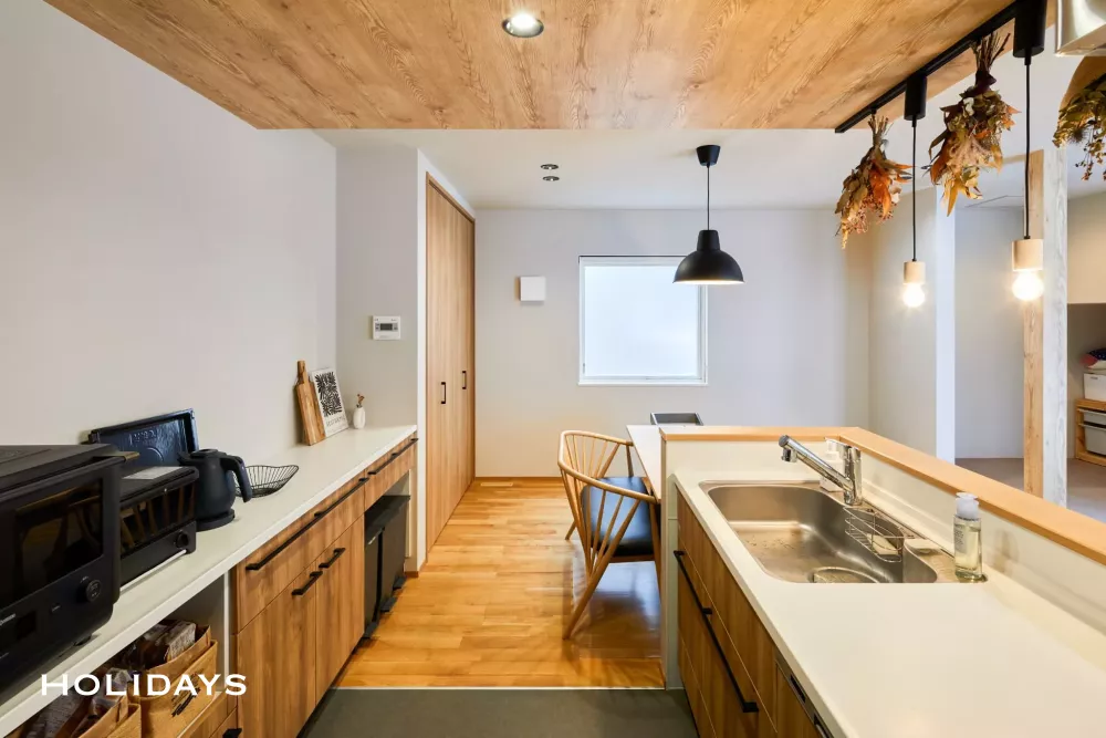 キッチンの天井面に木目調クロスで仕上げた下がり天井を設置。高さに変化をつけることでメリハリを持たせた。天井にはダクトレールを取り付け、ペンダント照明だけでなく、スワッグなどお好みなディスプレイを楽しめる。