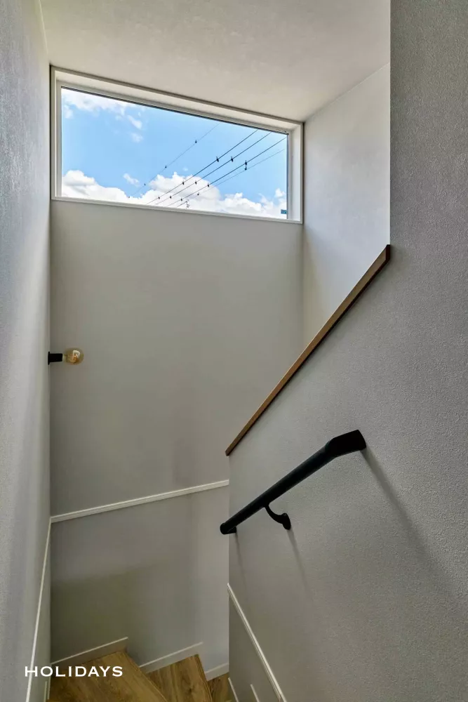 ロールスクリーンで仕切れるリビングイン階段を上がると、天井高に合わせて設置した高窓が。時間や季節によって空の変化を感じられる。