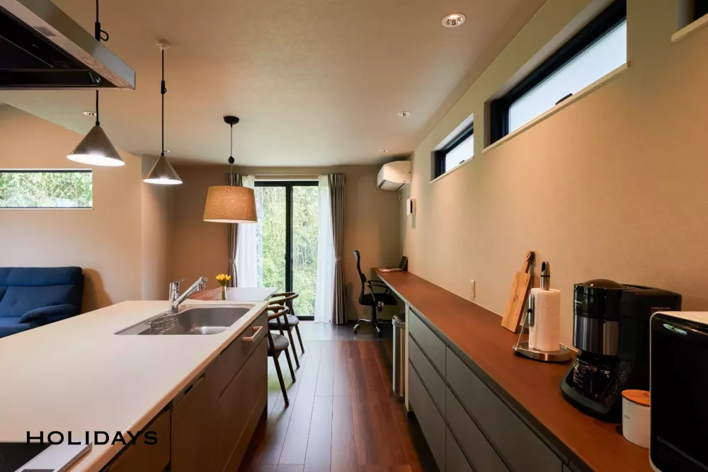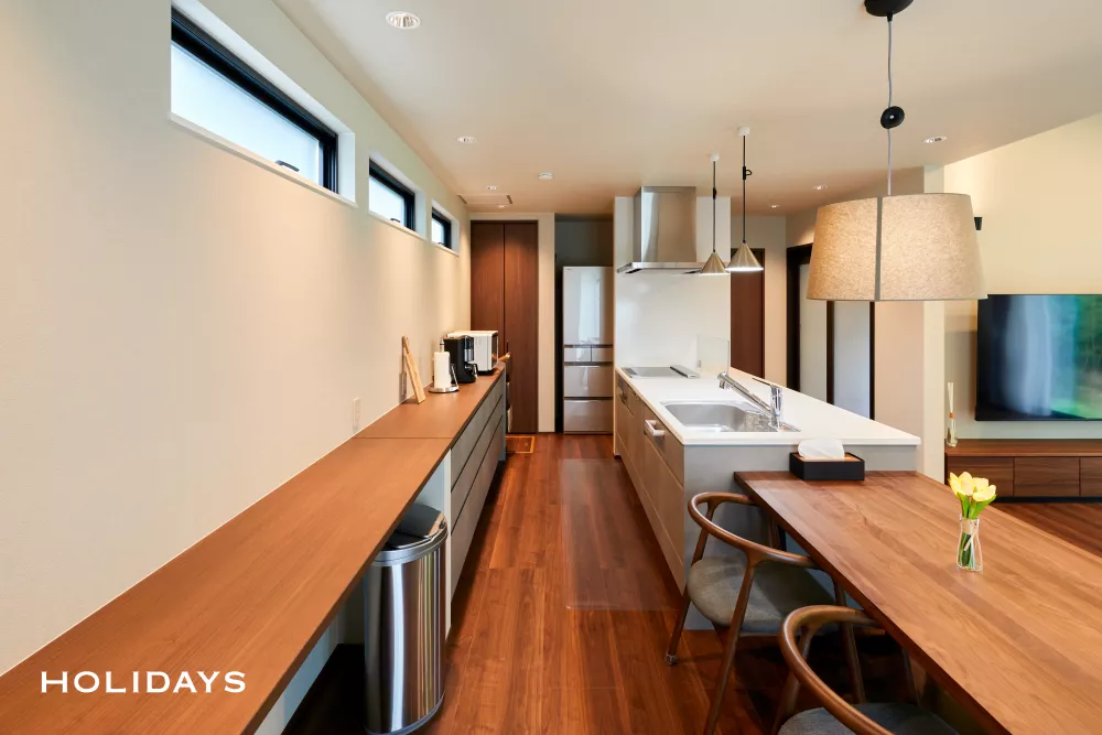 カップボード側には幅広カウンターを造作し、自宅でのリモートワークも可能となっている。