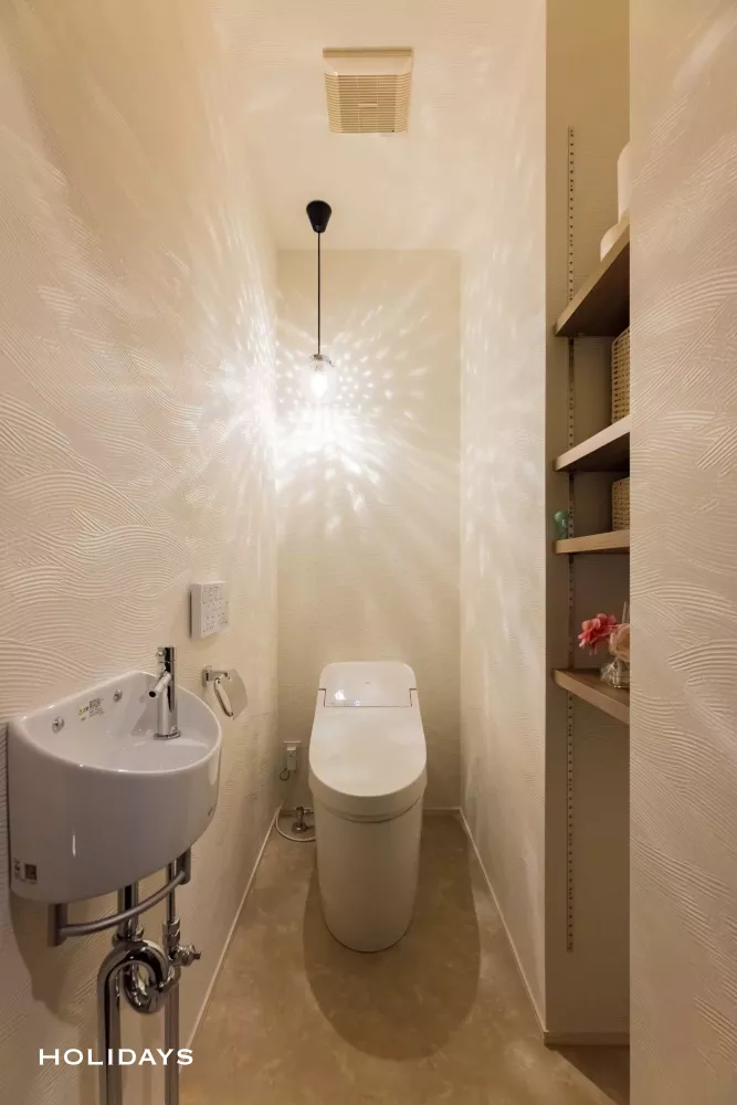 塗り壁調の壁紙に照明器具のゆらゆらとしたきらめきが空間全体に広がる落ち着きのあるトイレ空間。壁の一部を掘り込み、収納スペースとして活用できるよう可動棚を設けている。