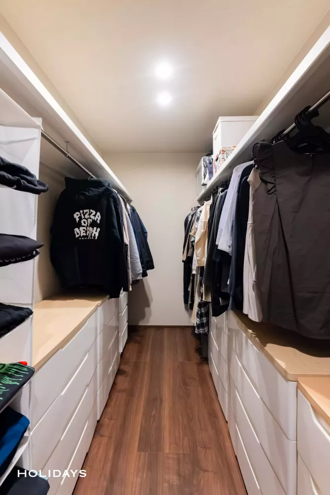 ホール部分から直接アクセス可能なウォークインクローゼット。サンルームに隣接する形で計画しているため、干す→収納までの動線が短く家事が時短できる。