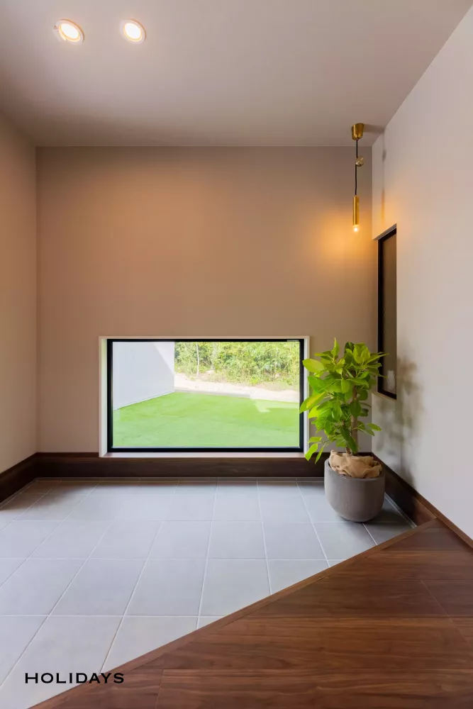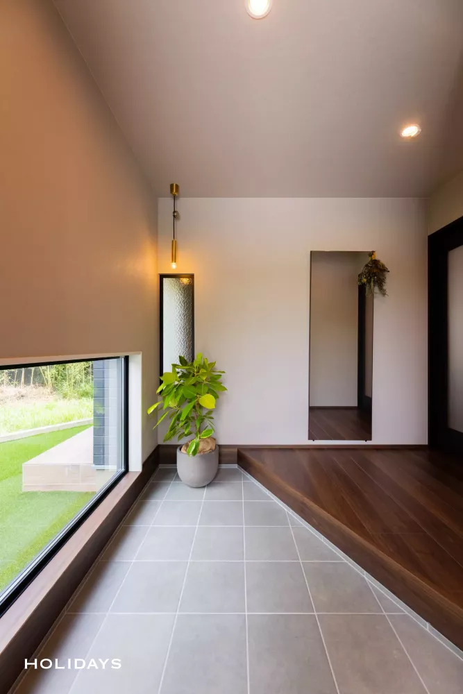 広々とした玄関土間に、地窓から見える緑豊かな景色が合わさり、よりおしゃれな雰囲気に。