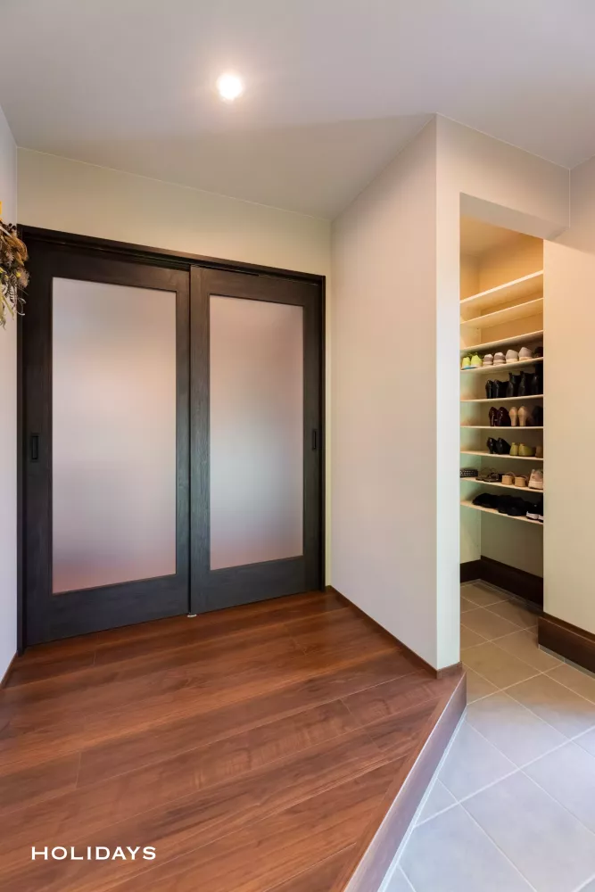 玄関を入って右手にはシューズインクローゼットを設けた。玄関土間を常にすっきりと美しい状態で保つことができる。