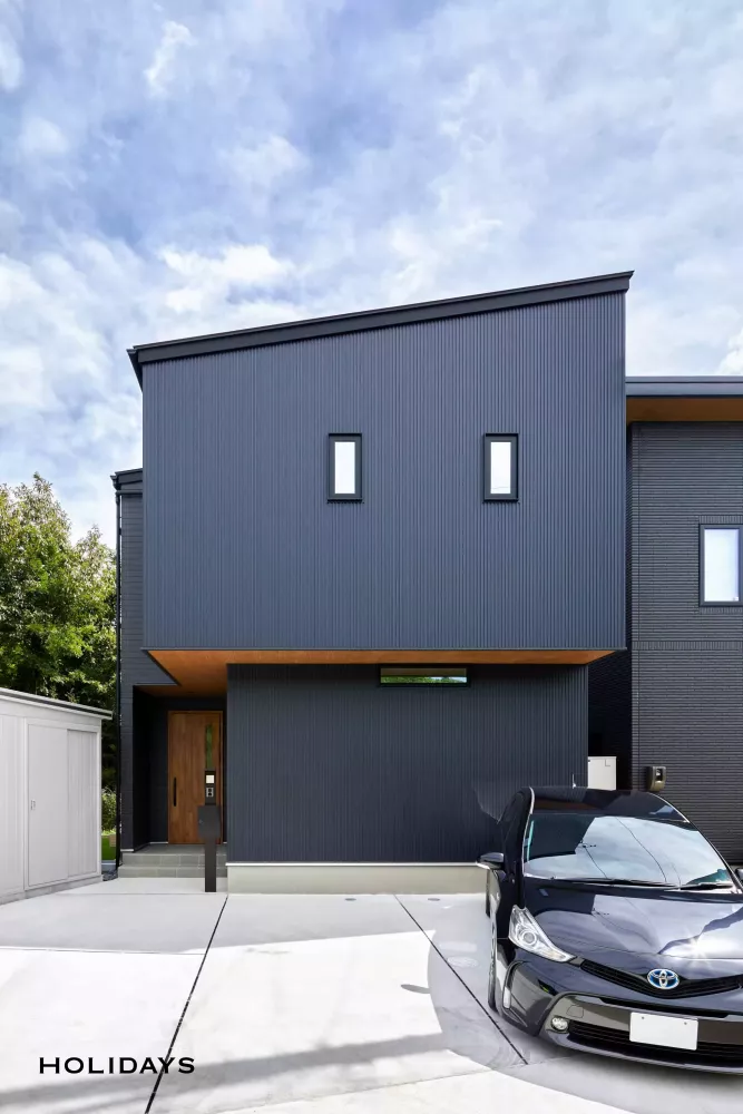 正面の凸部分をガルバリウム鋼板で仕上げたスタイリッシュな外観。玄関ドアと軒天の木目がアクセントになり目を惹く。