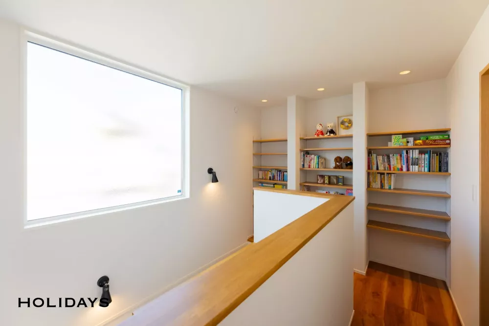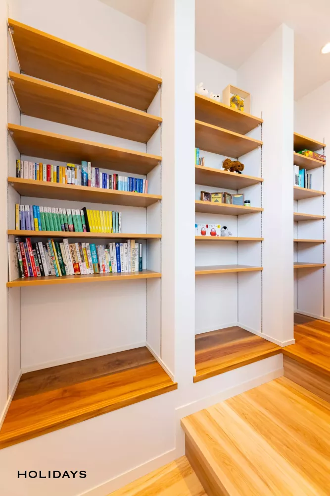 リビングイン階段を上がると可動棚スタイルの本棚が。ディスプレイ収納としても活躍し、家族の思い出の写真や季節ものを飾ることも可能。