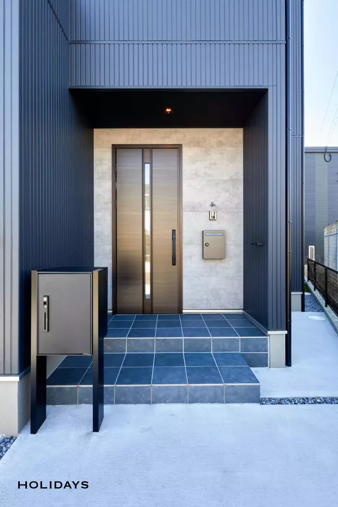 玄関周りは、外観全体の色合いと玄関ドアとの相性も考慮し、モダンを演出するグレーを選定。