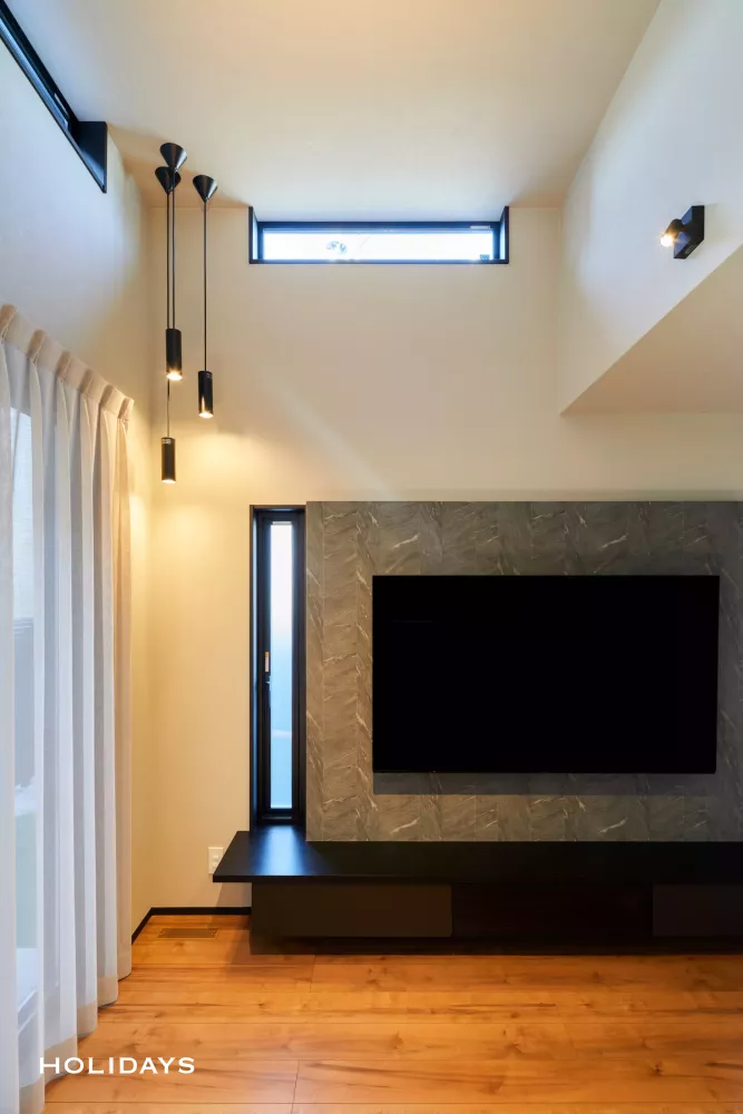 ダークトーンと木目の落ち着きのあるナチュラルモダンテイストなお家。テレビボードと造作したカウンタ―にはサッシが差し込まれ、一体型となった意匠性のあるリビング空間に。またHOLIDAYSオリジナルの全館空調「エアラク」を搭載しているため、部屋のどこにいても毎日快適に過ごすことができる。
