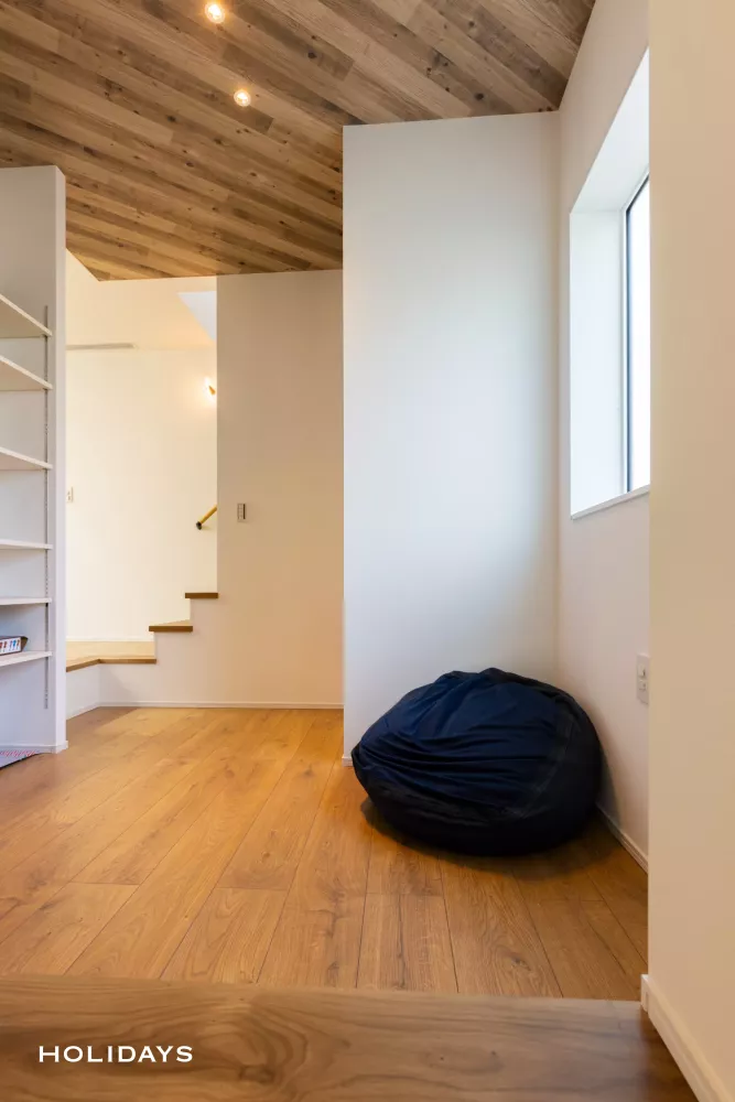 テレビ裏のヌックは、グレーの壁によってゆるやかに仕切られつつもLDKとの繋がりを感じられる間取りに。全館空調を搭載していることで、吹き抜けもヌックも常に快適な温度を保つことができます。