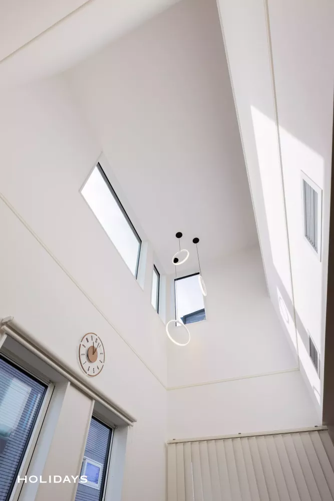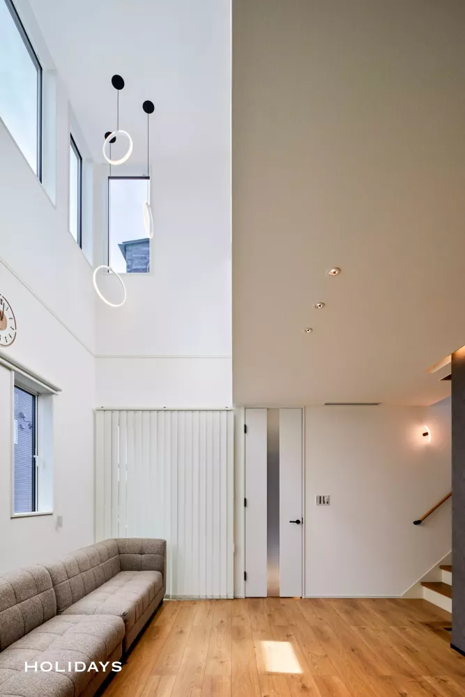 リビング上部には開放感のある吹抜けを設けることで、窓からは柔らかく明るい自然光がお家いっぱいに注ぎ込む。