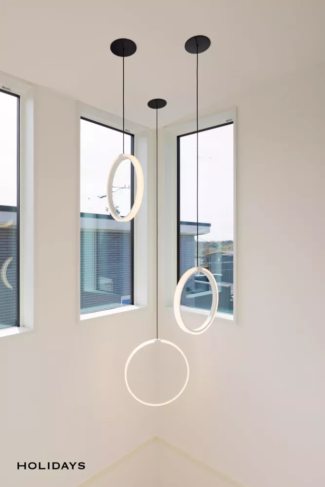 吹き抜けには、空間になじみつつもデザイン性の高い、円いカタチの照明器具を選定。