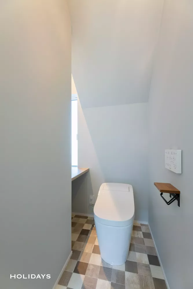 階段下のデッドスペースをうまく活用した1階トイレは、天井を含むクロスを清潔感のある淡いブルー グレーで統一。人目を気にしない位置に窓を設けることで、全体的に明るい印象となった。