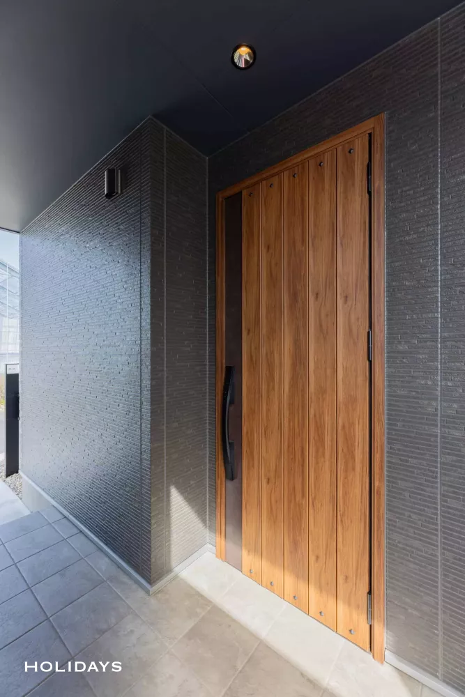 ブラックの外壁に、荒削りな板を組み合わせたような木目の玄関ドアが映える。