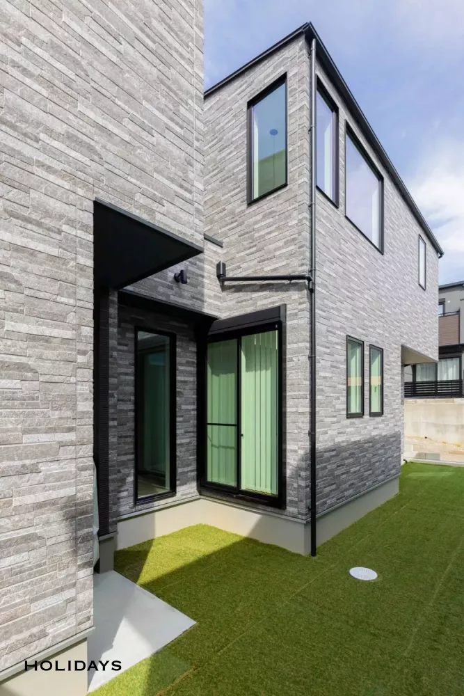メインにグレーを、アクセントにブラックのカラーを入れ、サイズ感の異なる2つの石目調サイディグを綺麗に組合せた。すっきりとしたまとまりがありつつ、インパクトのある石目調のお家は、一際目を惹く外装に。