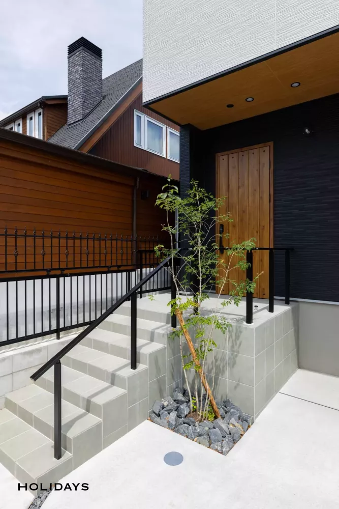 玄関までのアプローチをコンパクトにまとめながら、シンボルツリーが目を惹く外構に。玄関前は全体的に軒がでている為、少しの雨であればしのぐことができる。