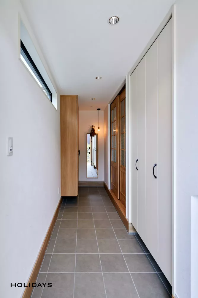玄関ドアを開けると奥まで続く広い土間スペースがあり、正面のペンダントライトがあたたかい光で迎えてくれる。奥の扉からは直接LDKに繋がる間取りに。