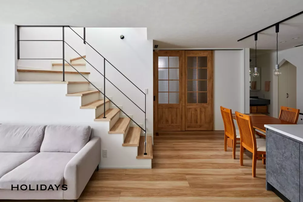 リビング階段は、ひな壇階段とアイアン手摺にすることで抜け感のある開放的な空間に。写真右側、リビングの一角には魅せる収納もあるため、自由に飾ることができる。