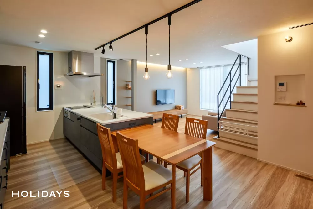 全館空調ならではのひと続きの間取りで、毎日の生活動線がスムーズに行えるよう計画しています。内装、外装ともに色味をしぼってデザインにこだわっていただき、シンプルながらもお施主様の好みが表れるお家となりました。