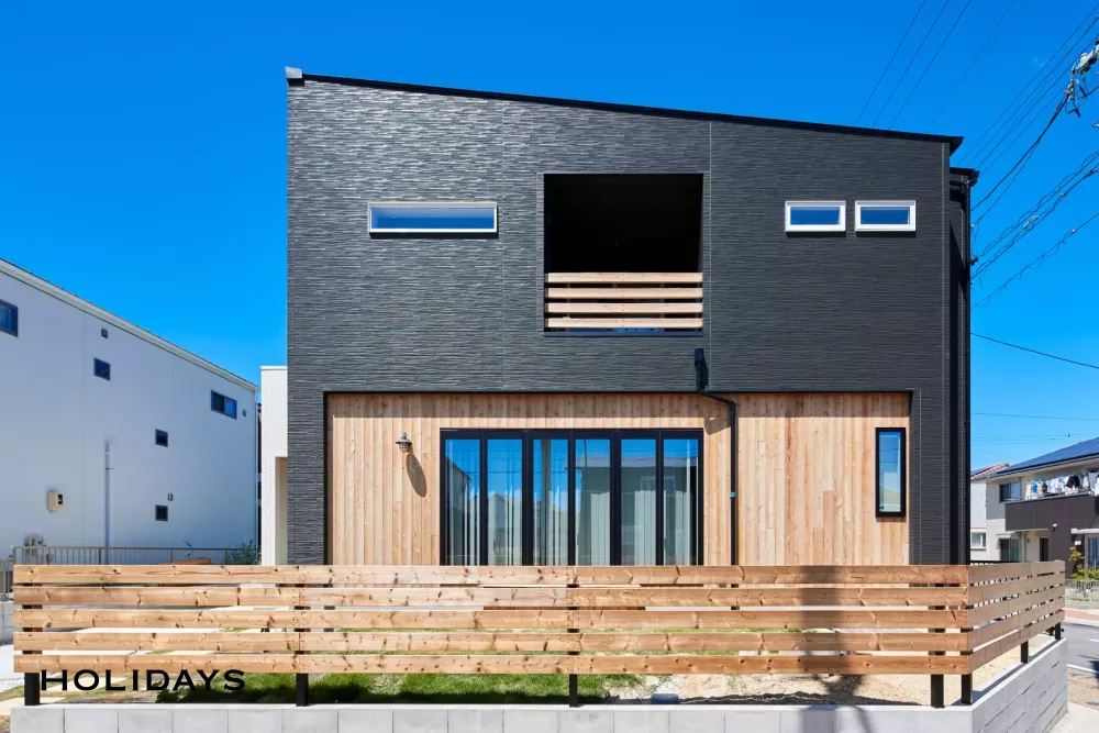 木材部分以外も外壁をネイビーにするか、ブラックにするか、ホワイトにするか、、、様々なパターンを考えて考えぬき辿り着いた、施主様こだわりの外観です。
