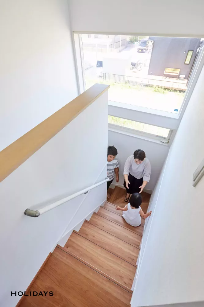 階段にも大きな窓をつけ 開放的に