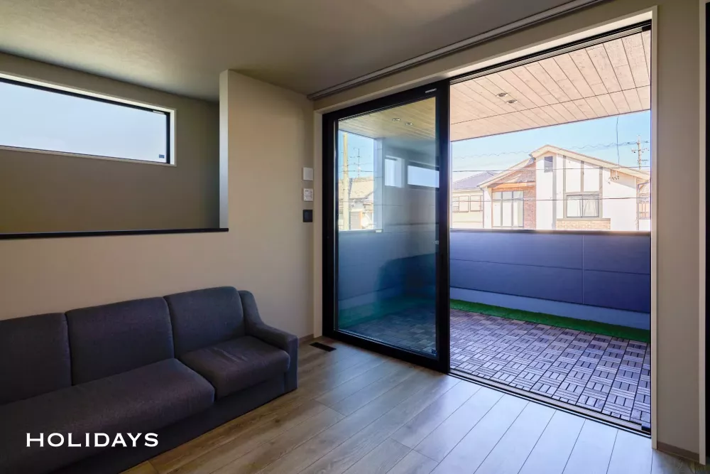 ベランピングにも最適なバルコニーは、隣家側に壁を設けているためプライバシーの確保はもちろん、雨が降っても濡れることなく安心して楽しむことができる。