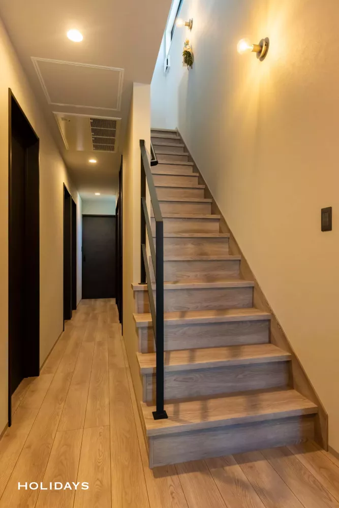 ブラックのアイアン手摺を採用したひな壇階段。真鍮古美色のブラケットライトが、まるで海外のお家のような雰囲気を出している。