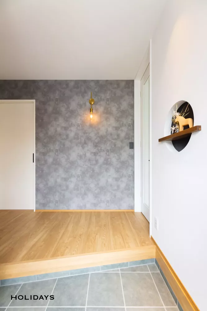 施主様のお気に入りがぎゅっと詰まったこだわりの玄関まわり。ドアを開けた正面にはグレーのモルタル調クロス+真鍮のライトを取り入れ、帰るたびにワクワクするような玄関になった。