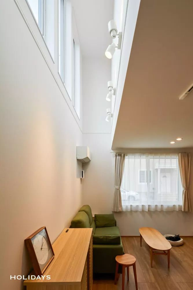 階段下をネコちゃん専用のトイレスペースにすることで空間を有効活用しました。またリビングの一角には吹き抜けと高窓を採用し、プライバシーを確保しながらも明るい空間となっています。