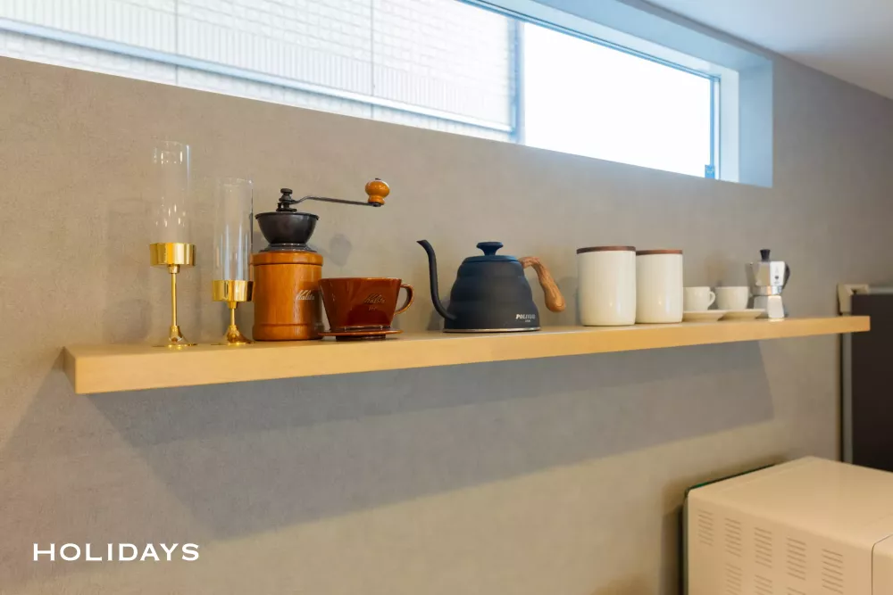 キッチンはシンプルにまとめつつ、カップボード面にはグレージュ色のアクセントクロスで柔らかな印象に。カップボード上部には魅せる収納棚も完備している。