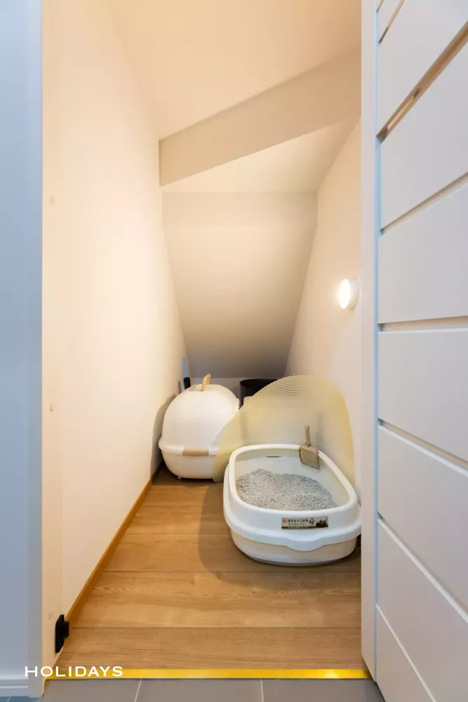 ネコちゃん専用のトイレスペースが。洗面脱衣室の扉からトイレのお掃除が可能になっている。においを考慮し、扉には通気性のあるルーバーデザインの物を採用した。