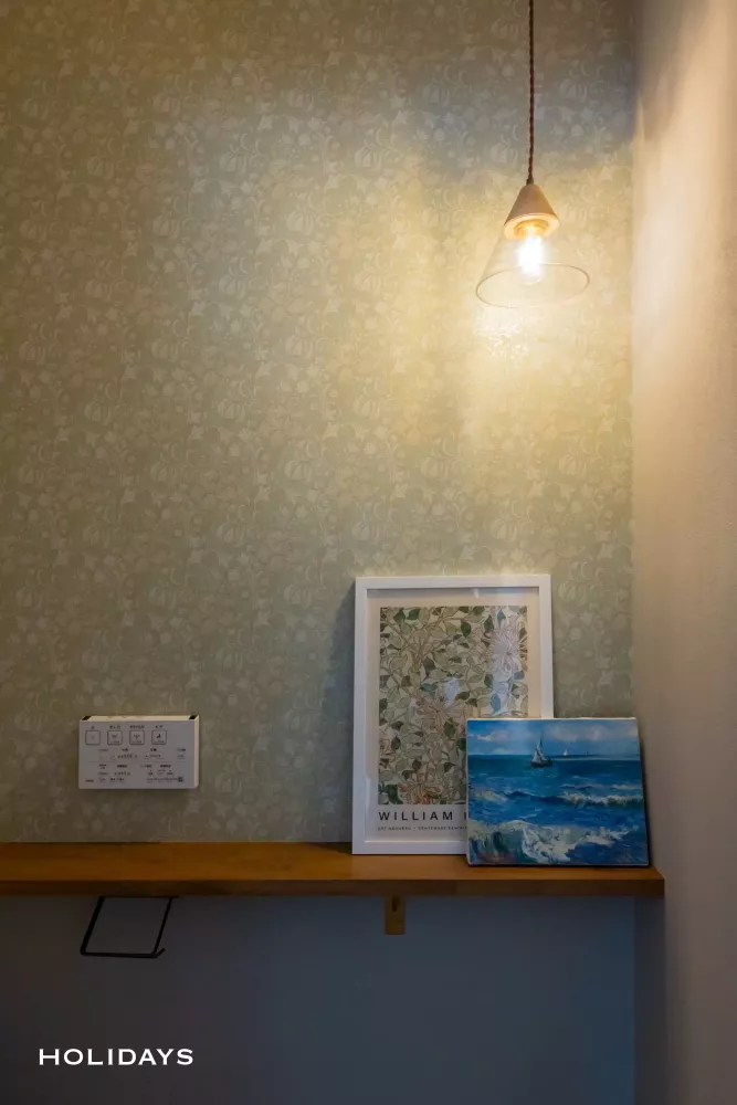 飾り用のカウンターの上下でアクセントクロスを貼り分けたこだわりのトイレ。あえて照明の明るさを控えめにすることで、陰影が生まれ落ち着きのある上品な雰囲気になっている。