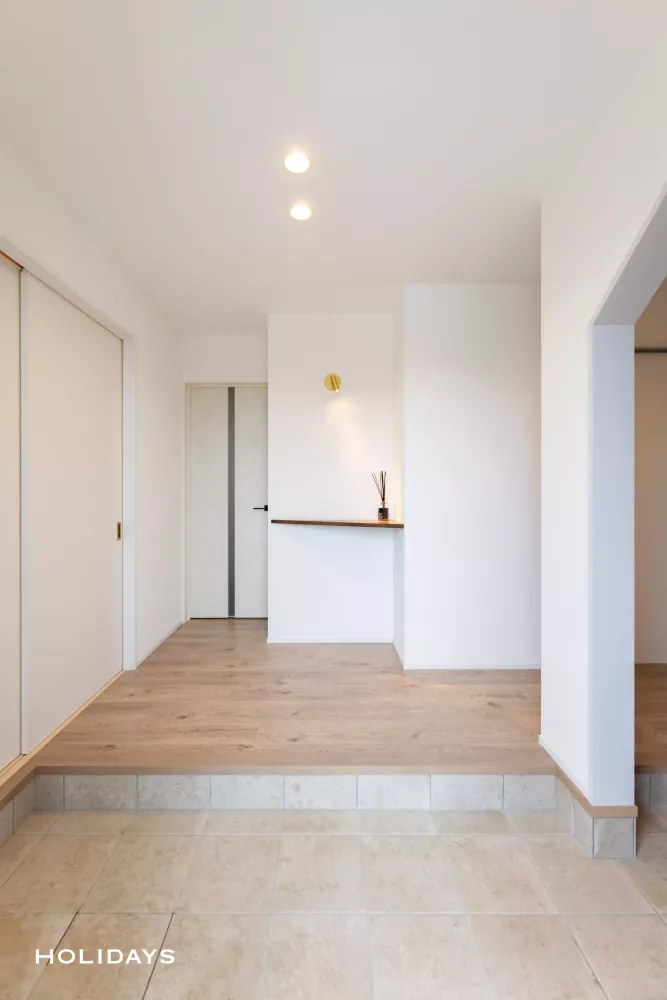 玄関にはレンガのようなタイルを採用。ヨーロッパの石畳を連想させる空間になった。