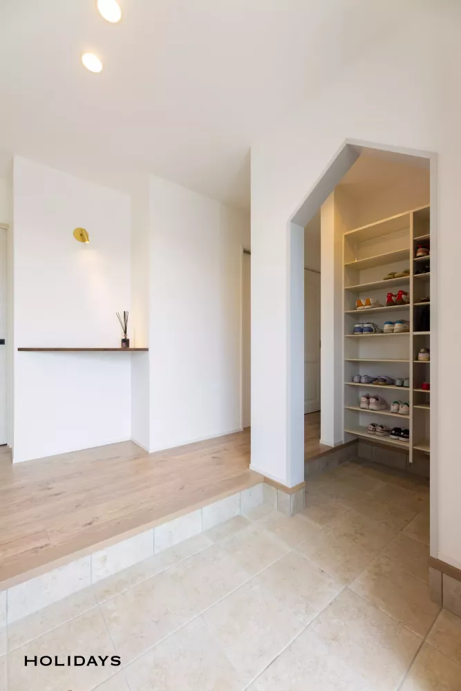 玄関横にはウォークスルータイプのシューズインクローゼットを設計。三角の垂れ壁がアクセントになっている。