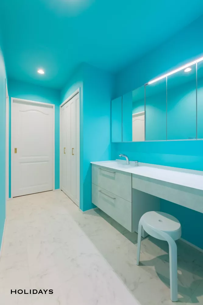 奥様こだわりの鮮やかなロビンスエッグブルーのクロス。大理石調の床とアールの框組の扉を合わせることでヨーロッパの世界観へ。透明感のあるクリスタルカウンターは毎朝のメイクが楽しくなる。