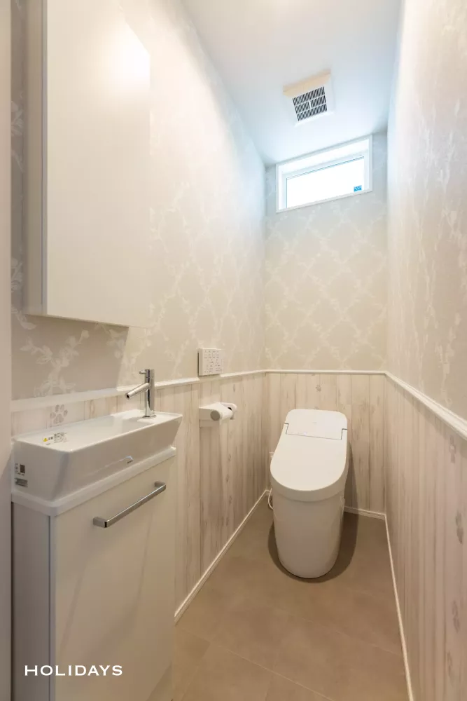 白を基調としつつ、木目調と格子柄のクロスを組み合わせたトイレ空間。高窓のため外からの視線を気にせず光を取り入れることができる。