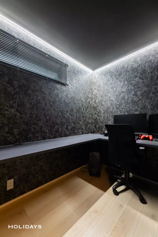 ご主人様のゲーム部屋は、ブラックを基調としたライン照明が目を引く男前な空間。防音材も入れゲームに熱中できる空間になっている。