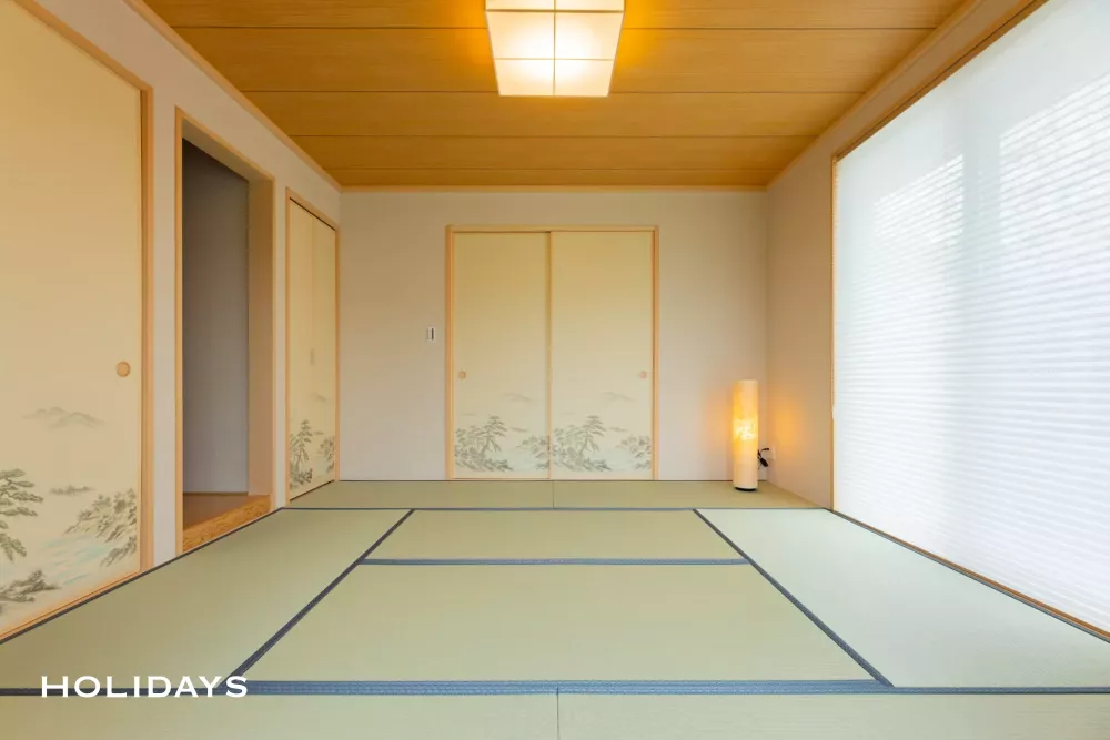 来客が多い施主様のため、お住まいの一室に和室を設けた。空間の材質にもこだわった本格的な現代大壁和室には、玄関ホールとつながる扉に戸襖を採用し、フレンチスタイルのテイストを崩さないデザインにしている。