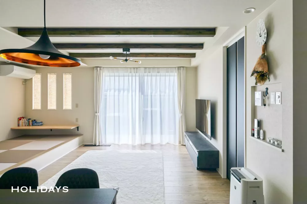 LDKの一角に小上がりの畳コーナーを設置。色味はお部屋のグレーベージュの雰囲気に合わせることで、陽射しを遮るのに採用したプリーツスクリーンの和室っぽさを入れつつもリビングに溶け込むようにした。