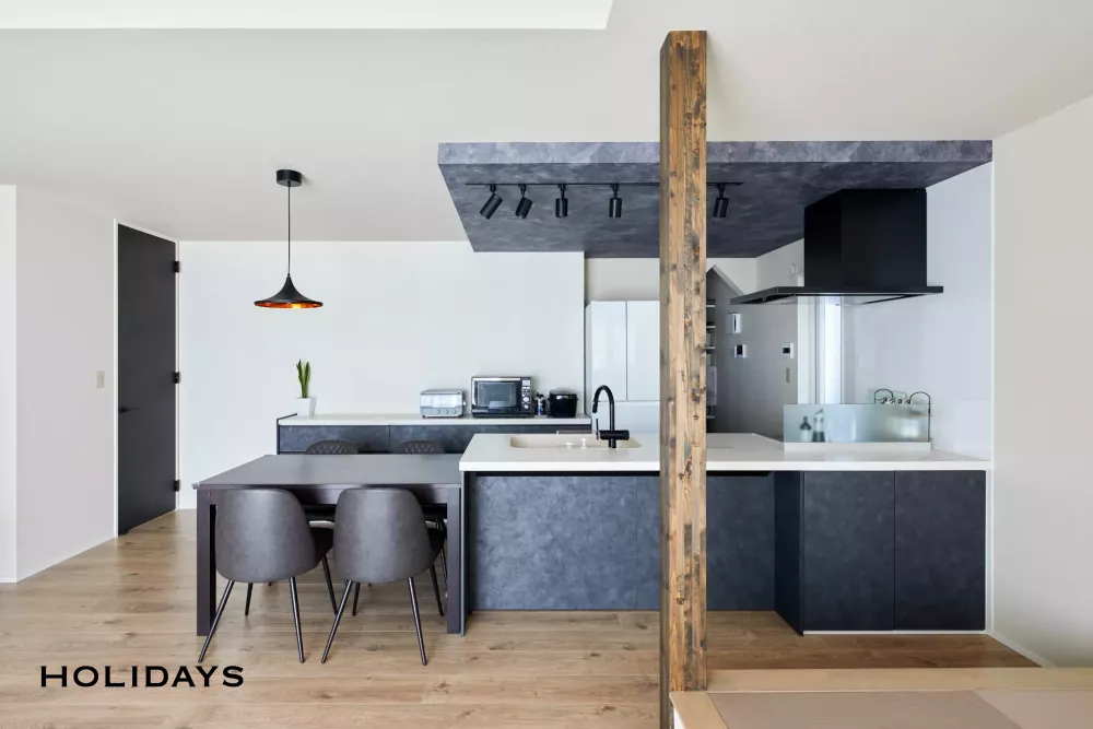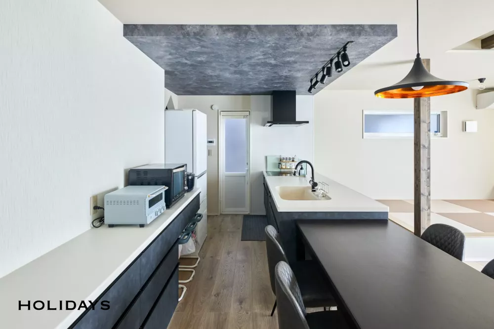 リビングとは反対にキッチンは天井を折り下げ、見た目の素材感を変えることで空間のアクセントに。