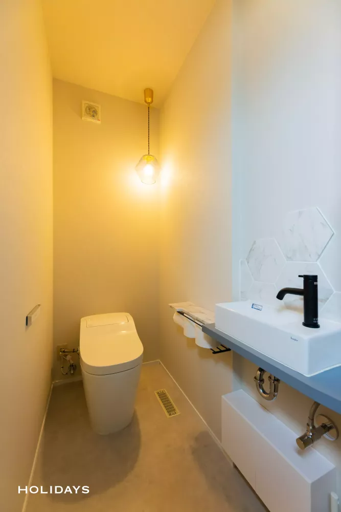 トイレの手洗いボウル周りにはタイルを施工し、水はね防止+意匠性UP。ヘキサゴン形のタイルが空間の良いアクセントになっている。