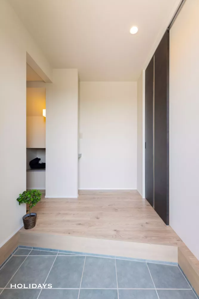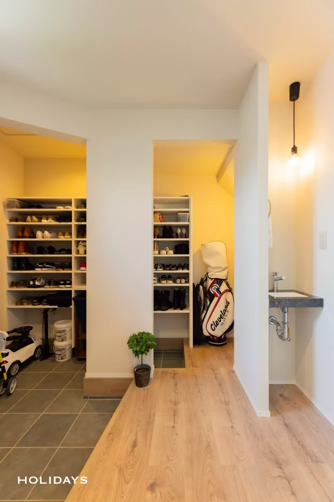 玄関ホールにはミニ手洗い器を設置。帰宅後にすぐ手洗い・うがいが出来る動線により衛生面◎玄関土間からそのまま繋がるウォークスルータイプのシューズクローゼットは大容量でらくらく収納が可能。