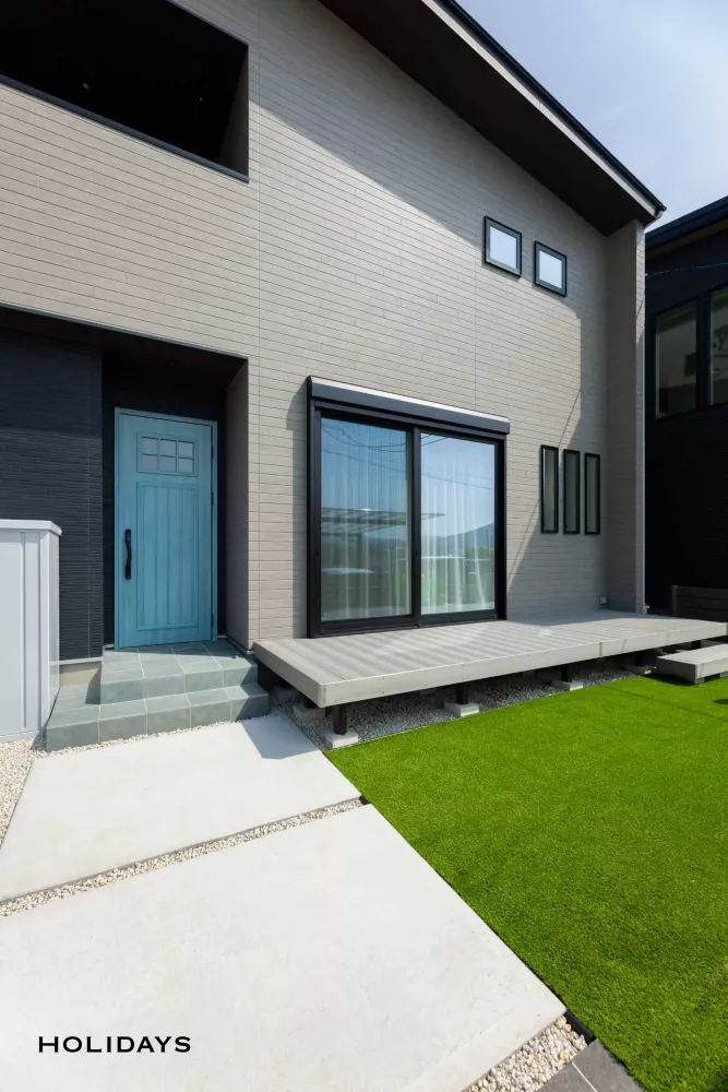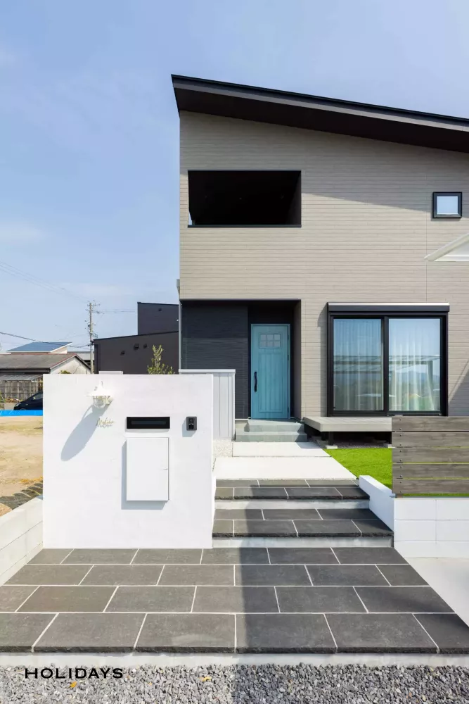 鮮やかなアイスブルーの玄関ドアがポイント。